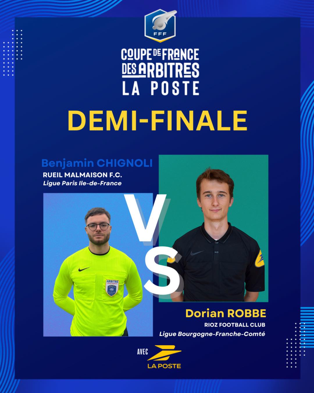 Lors de cette demi-finale de la compétition des arbitres, Dorian sera opposé à Benjamin CHIGNOLI, arbitre du FC Rueil-Malmaison club de la Ligue Paris Île-de-France.