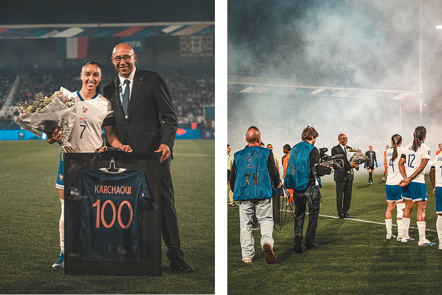 Sakina KARCHAOUI, célébrant son 100ème match en Équipe de France, récompensée par le Président de la FFF Philippe DIALLO.