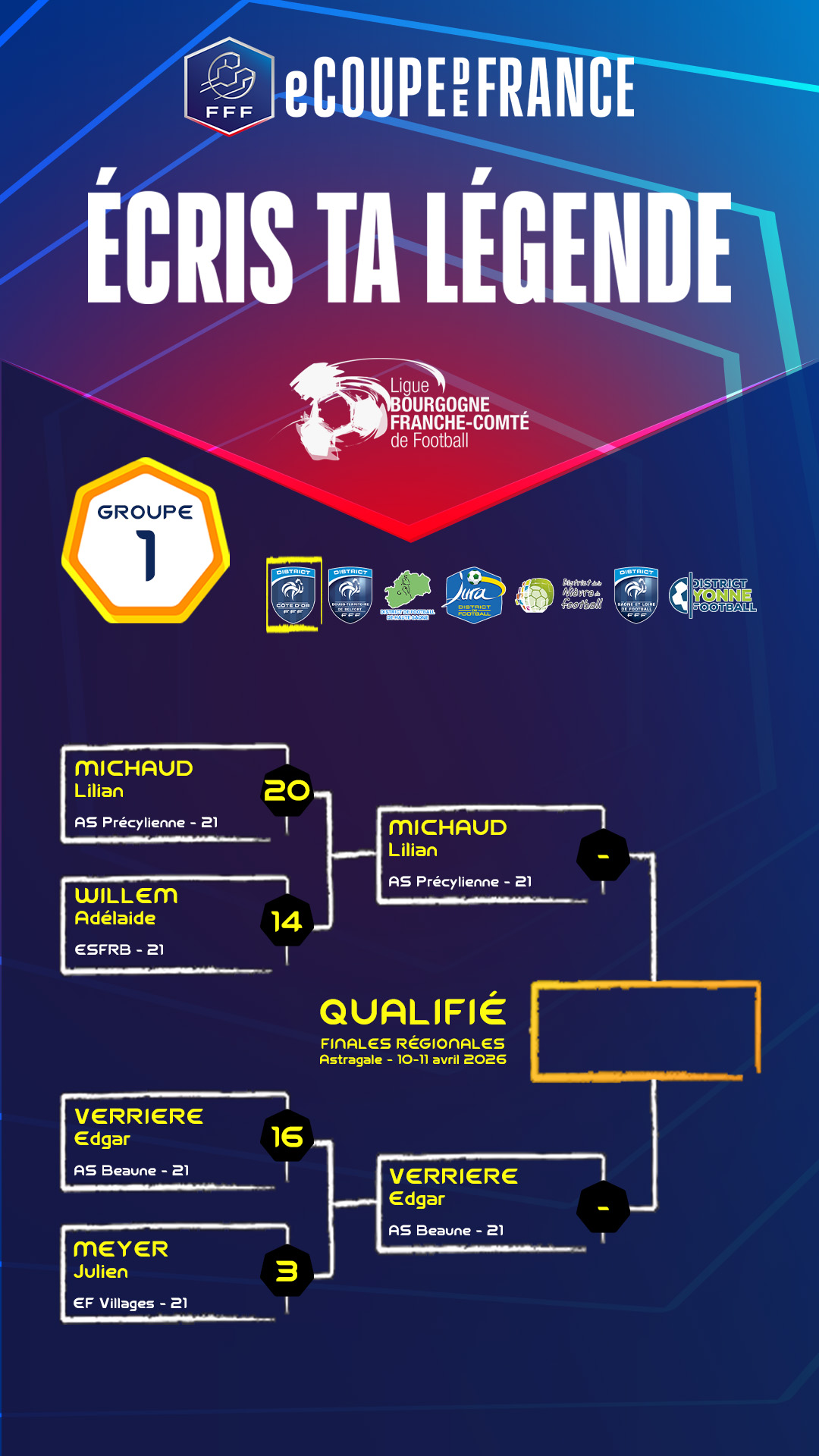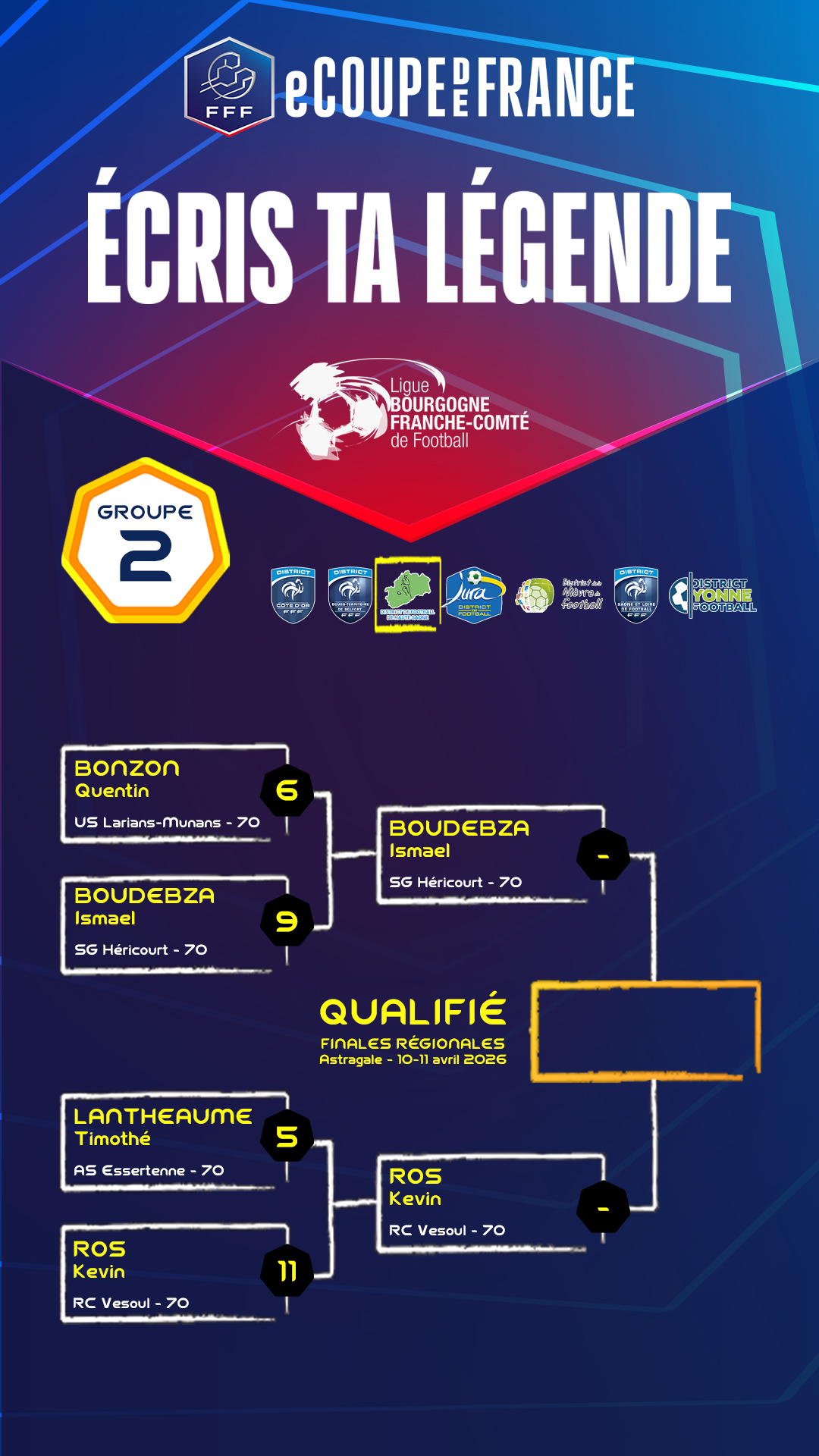 Découvrez ci-dessous les résultats des différents groupes (scores cumulés des 2 matchs disputés). Bonne chance à tous les joueurs qualifiés pour les finales de la phase District.