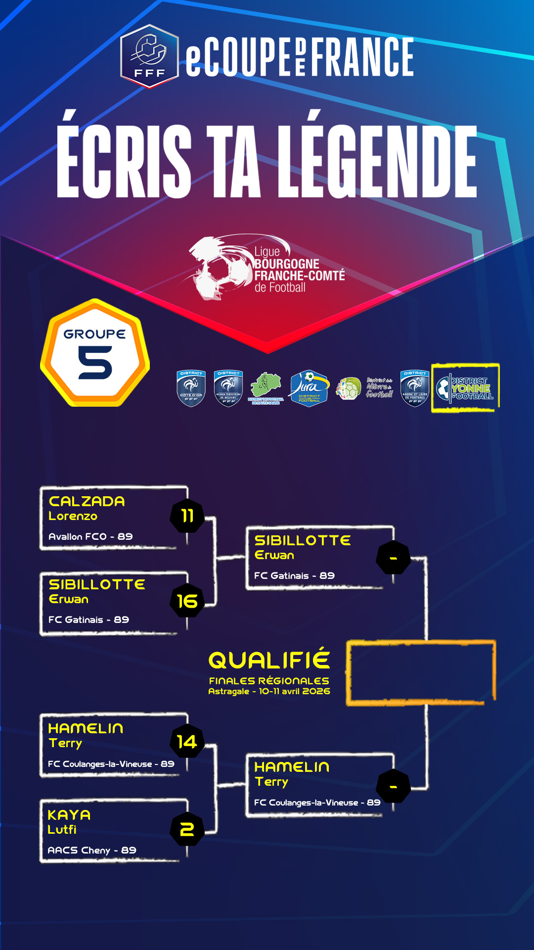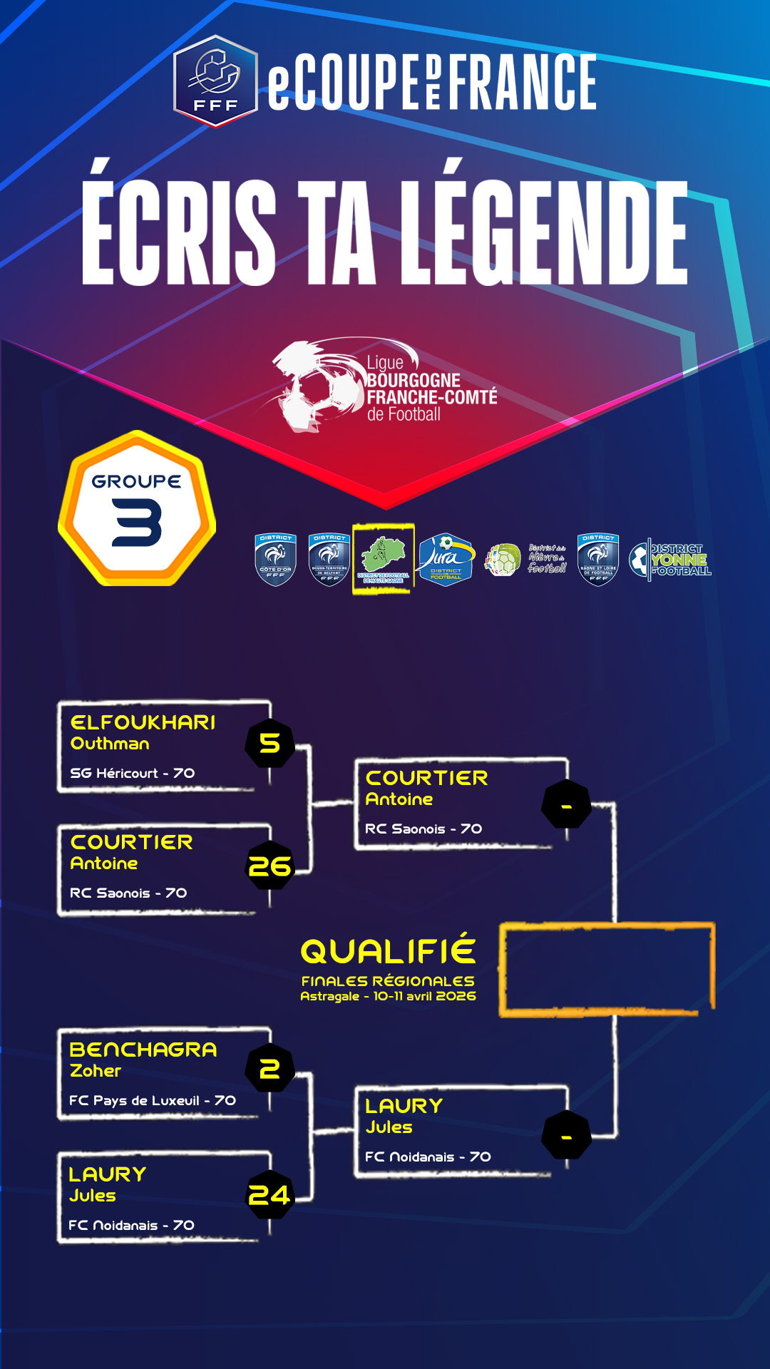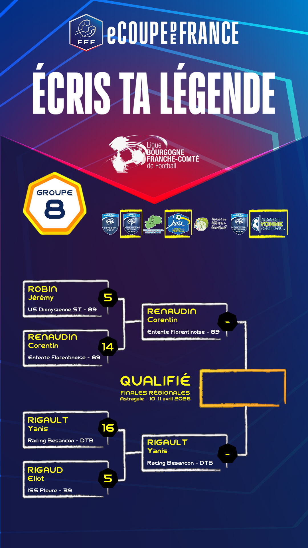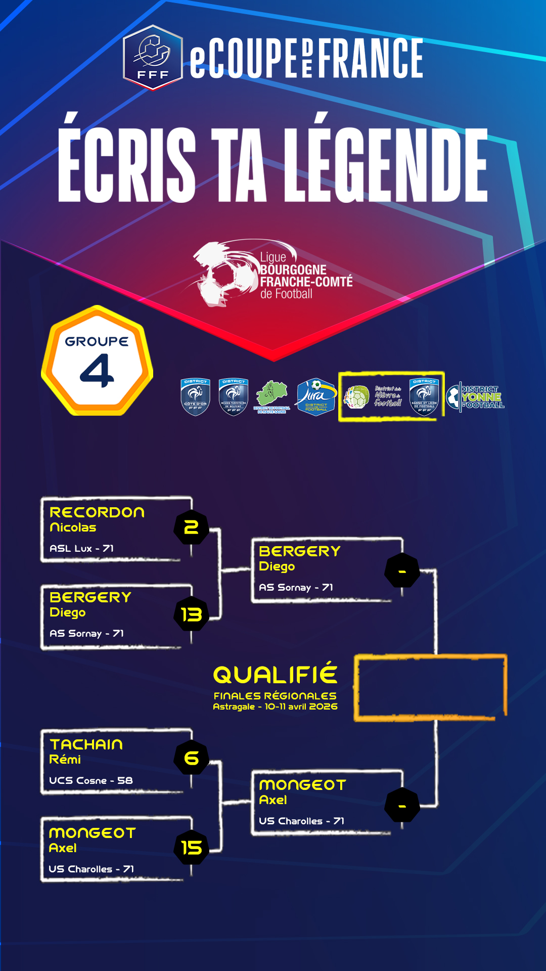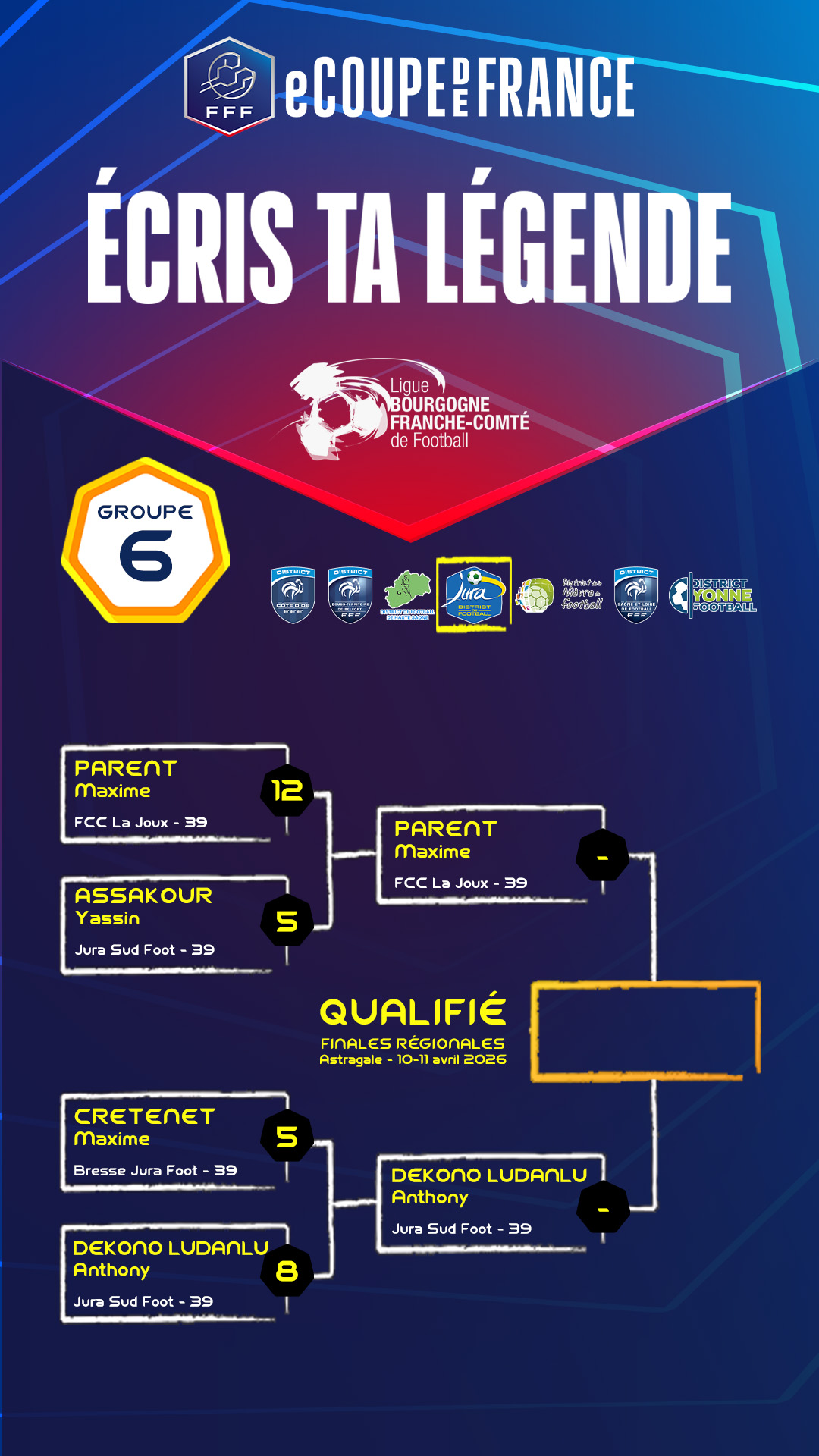 La eCoupe de France 2026 est lancée et les 32 inscrits ont joué leur confrontation du 1er tour correspondant à la phase départementale avec 8 groupes.