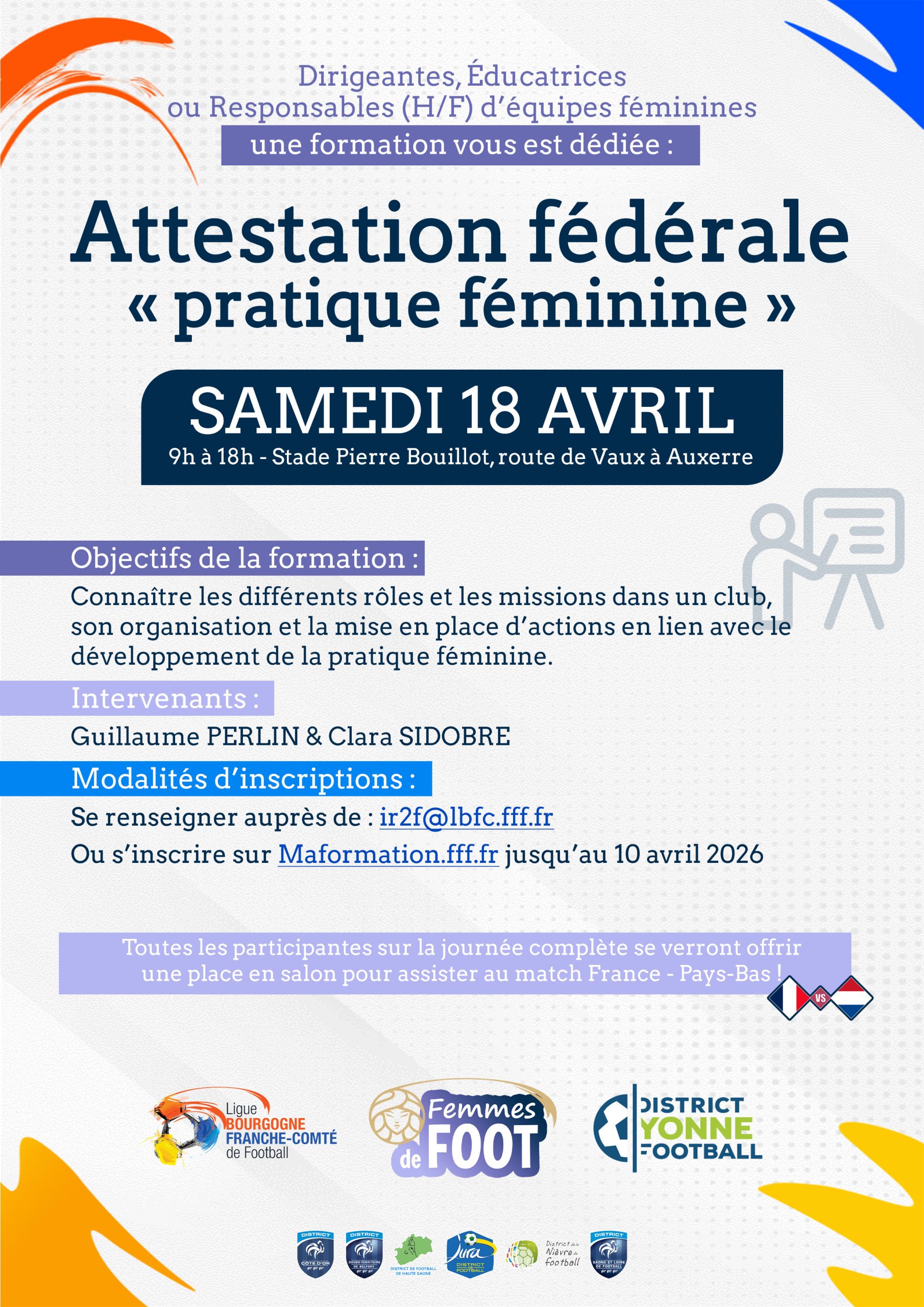 Pour clôturer cette journée de formation, les femmes ont été invitées au match international féminin France – Pologne au stade Gaston-Gérard de Dijon. La prochaine journée de formation aura lieu le samedi 18 avril prochain à Auxerre, dans le cadre du match international féminin France – Pays-Bas.