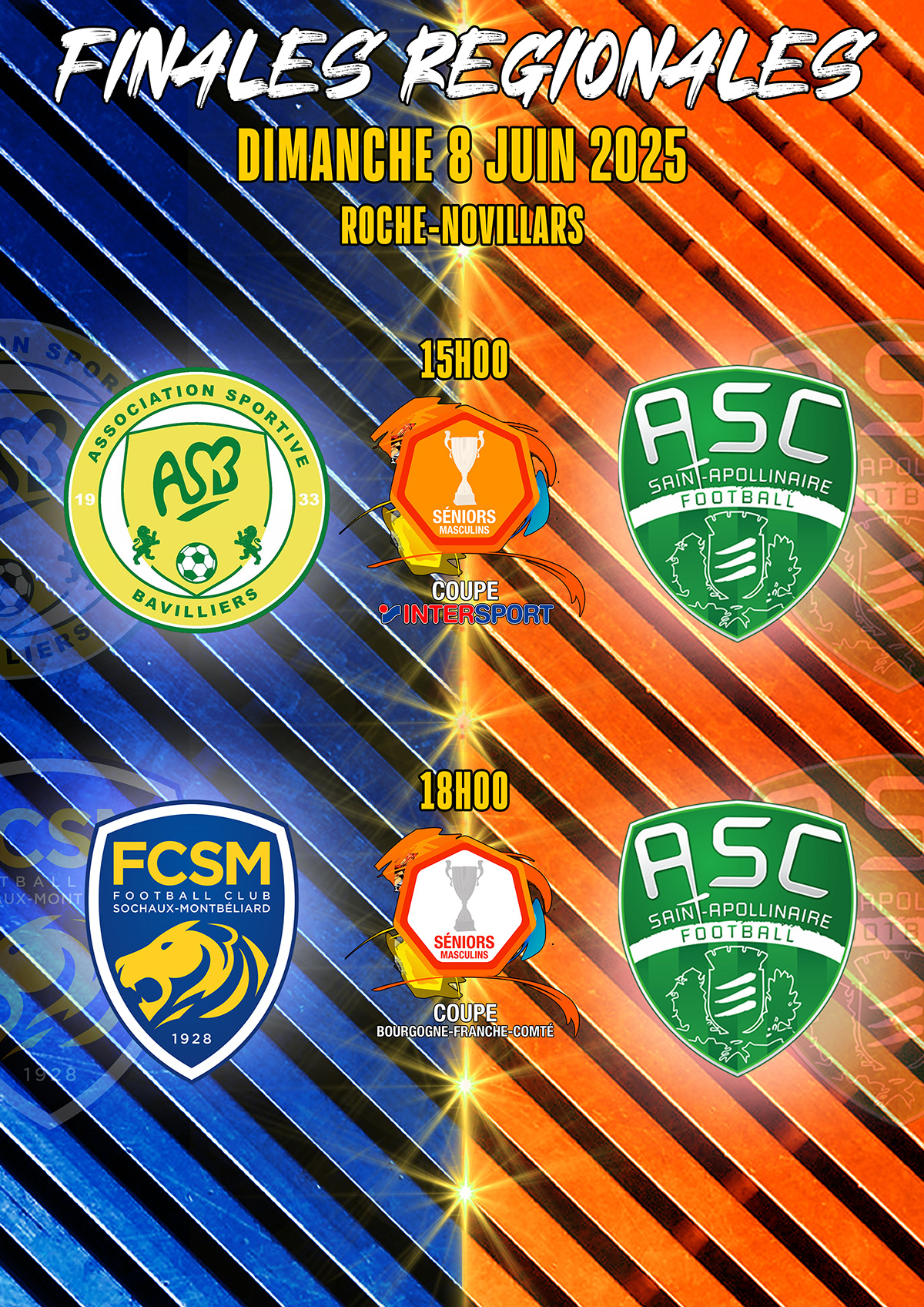 Les finales de la Coupe Intersport et de la Coupe Bourgogne-Franche-Comté Séniors masculine se joueront dimanche 8 juin à Roche-Novillars (14h et 17h). La première opposera l’AS Bavilliers 2 à l’ASC Saint-Apollinaire 2 qui a éliminé le tenant du titre Jura Sud Foot 2. Pour la Coupe BFC, la réserve du FC Sochaux-Montbéliard défendra son titre face à l’ASC Saint-Apollinaire.
