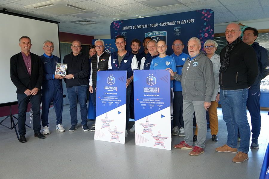 la remise officielle du Label Jeunes FFF Crédit Agricole au RC Voujeaucourt, doublement labellisé, en présence de Claude DELFORGE, Président de la LFA, Nicolas BOURDIN, Cadre Technique National, Daniel FONTENIAUD, Président de la Ligue et Daniel ROLET, Président du District DTB, ainsi que des représentants du Crédit Agricole de Franche-Comté dont Aurélien ANCEL, Responsable de pôle d’agence bancaire, que nous remercions pour leur présence.